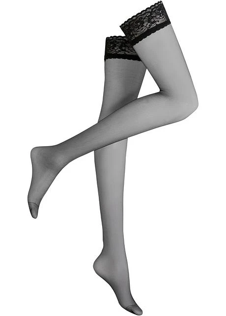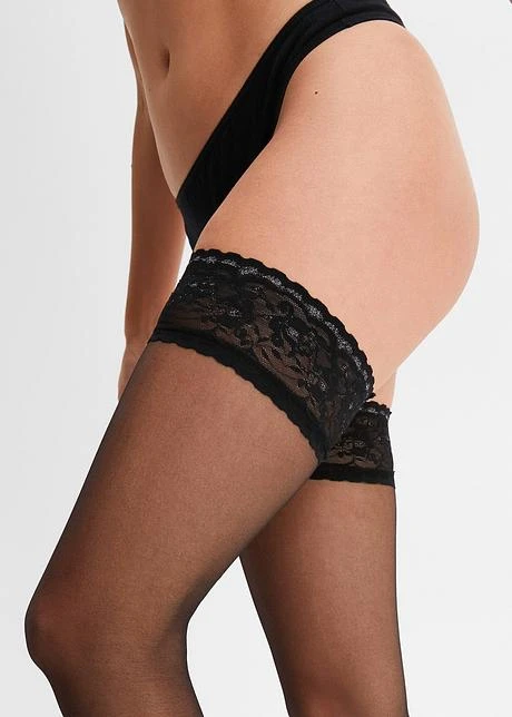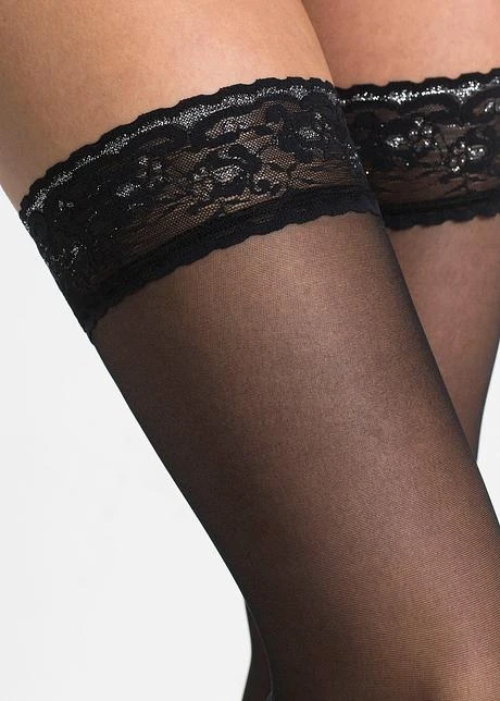 Ces bas auto-fixants vous donnent une élégance féminine. Jarretière en dentelle noire avec fil fantaisie argenté pour un effet scintillant à souhait.