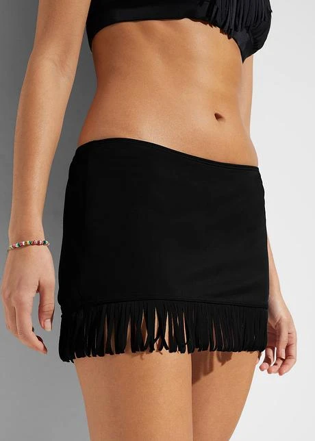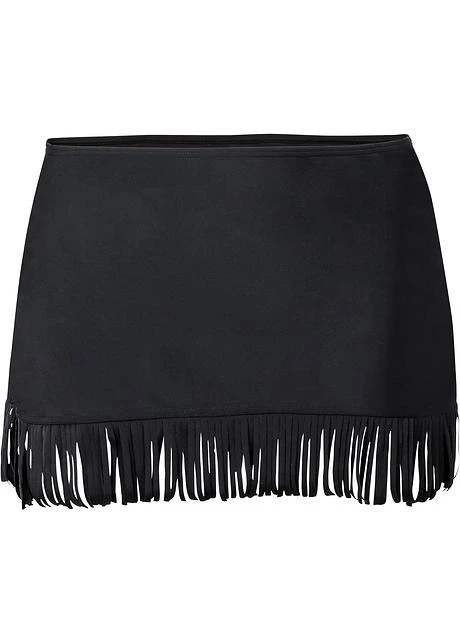 Bas de maillot avec taille élastique et jupette intégrée. Avec franges à la base. Doublure gousset.