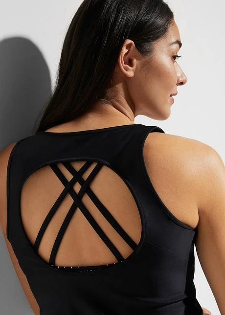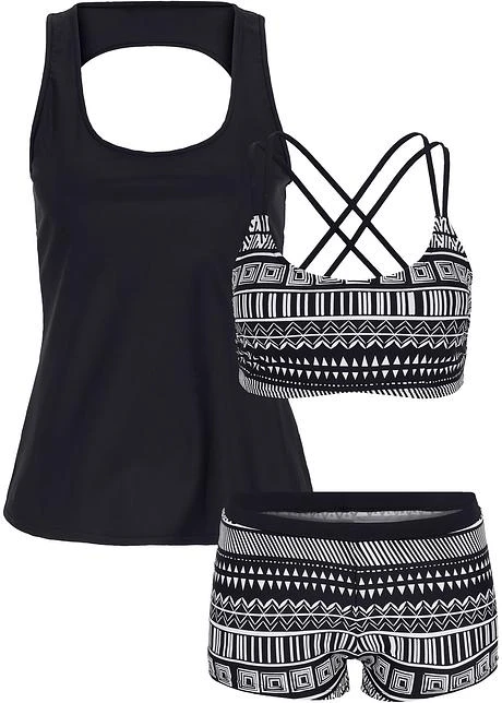 Ensemble tankini 3 pièces composé d’une brassière, d’un débardeur et d’un shorty, à porter ensemble ou séparément. Brassière à imprimé all-over et bretelles réglables, croisées dans le dos. Coques souples amovibles et bande élastique sous poitrine. Débardeur dos nageur.